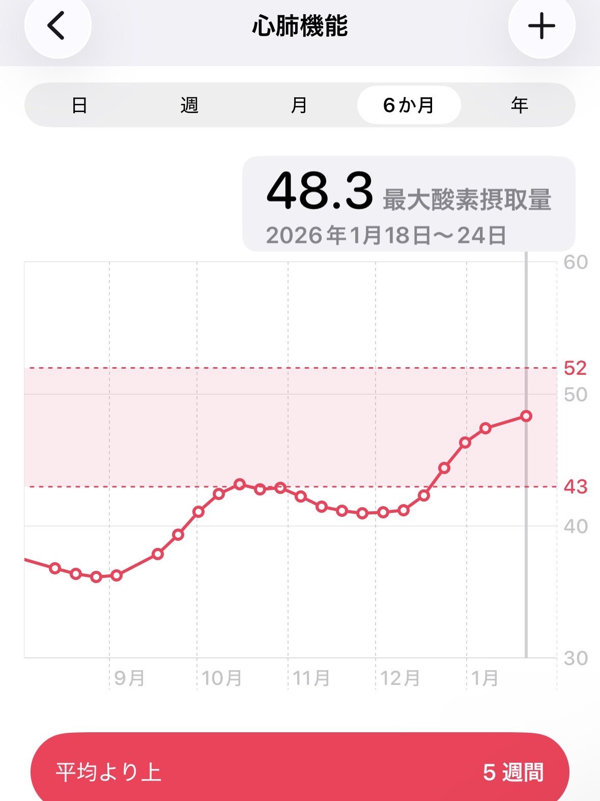 順調なランニングで12月から私のVO2Max(最大酸素摂取量)もぐんぐん伸びています。